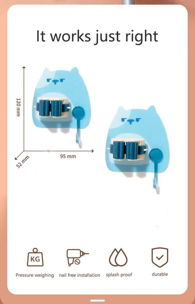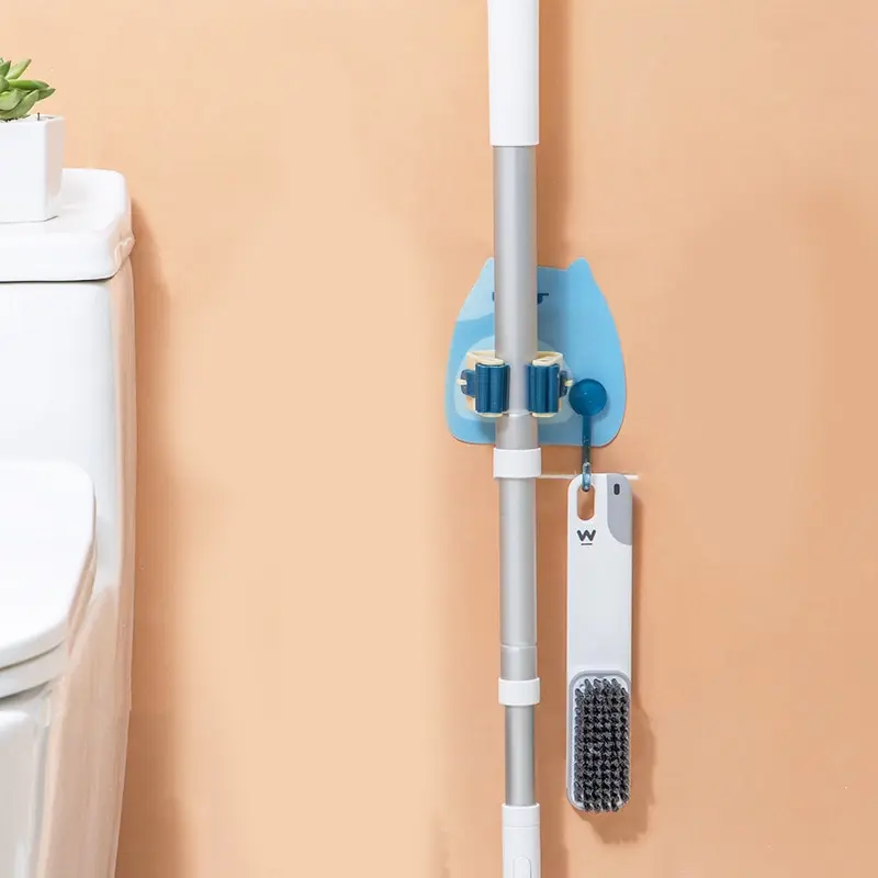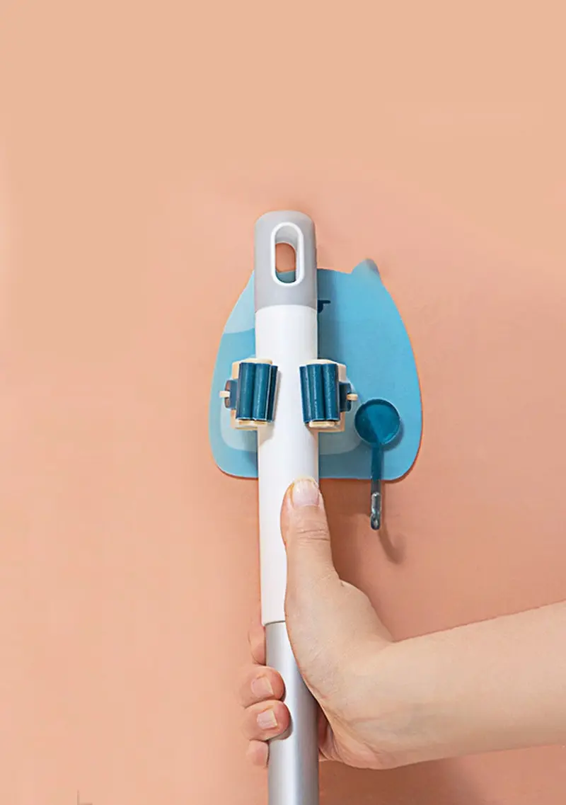 Features:This mop holder is cleverly designed to not only store things, but also decorate your home.This mop holder is made of plastic material and designed with elastic elastic slot, which is convenient for you to store various items, such as mop, mop, toilet brush, umbrella, etc.Side hooks allow you to store keys, towels, cleaning brushes and other small items to keep your bathroom tidy and organized.This mop holder is free-drilled and will not damage the wall, because it is waterproof and moisture-proof, and it is not easy to fall off, so it can be firmly attached to the wall.This mop organizer has a compact design that doesn't take up much space and can be installed in kitchens, bathrooms, and more.