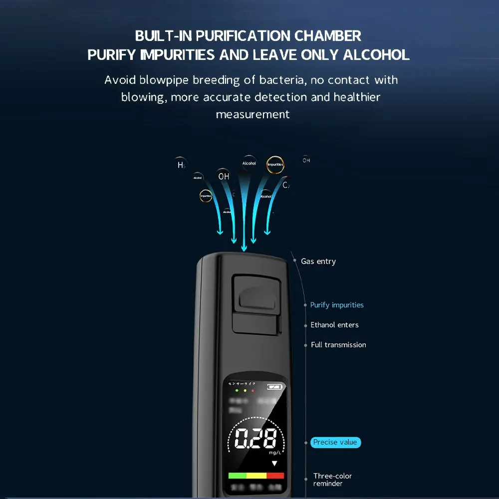 1. Built in purification room to purify impurities and leave only alcohol: to avoid bacterial growth in the blowing tube, not in contact with blowing, more accurate detection, and healthier measurement