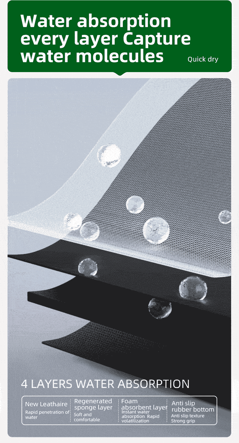 2. Nappa leather surface can absorb moisture quickly; Foam absorbent layer can absorb water instantly and evaporate quickly.