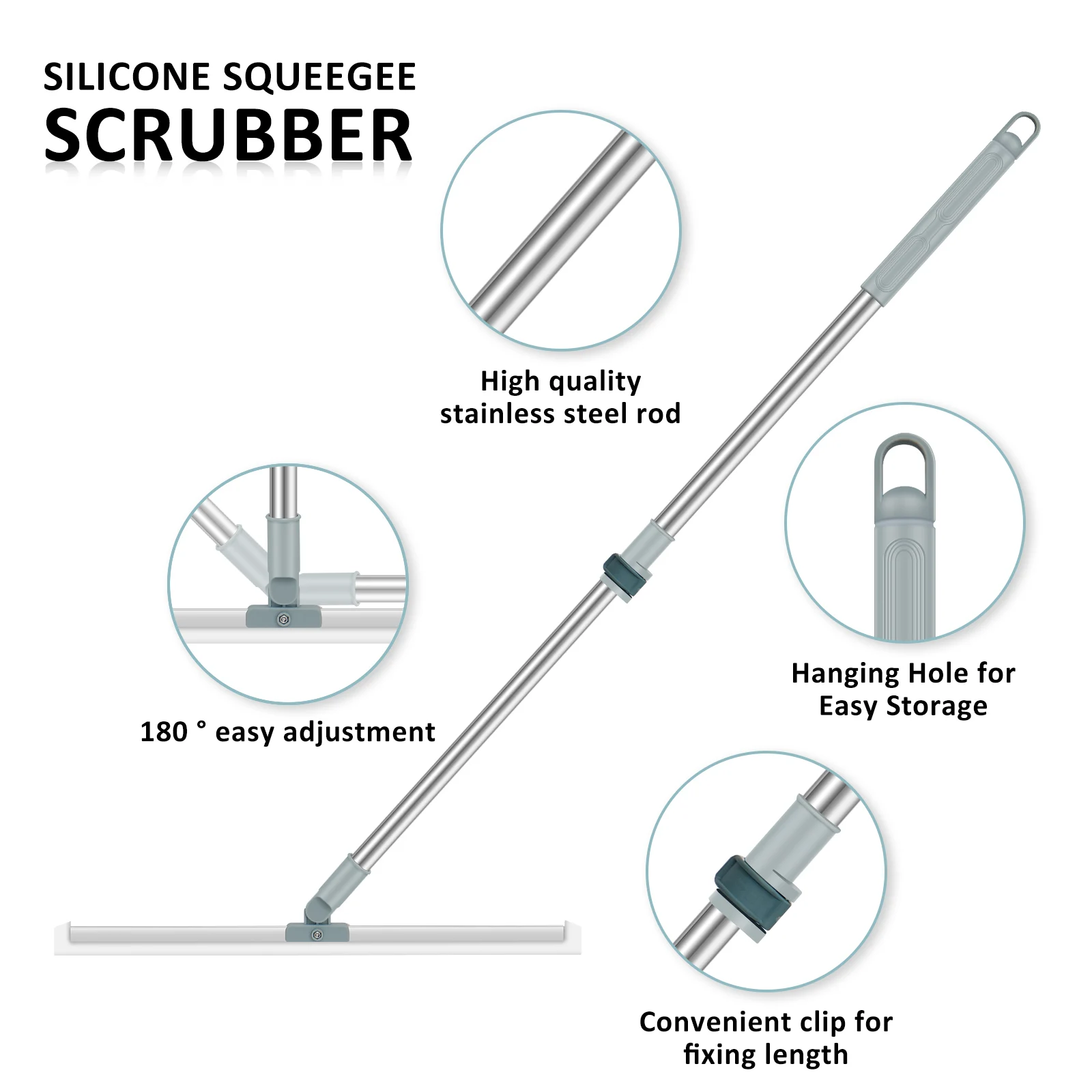 [Wide Application] The silicone squeegee scrubber combined sweeping, scraping, wiping 3 in 1 effects. With a wide 19.7in squeegee head makes cleaning a breeze. Perfect for cleaning water, oil without leaving marks. Suitable for cleaning bathroom floors, pool decks, windows, shower glass doors, tile floors, car windows, garages, backyards, etc.