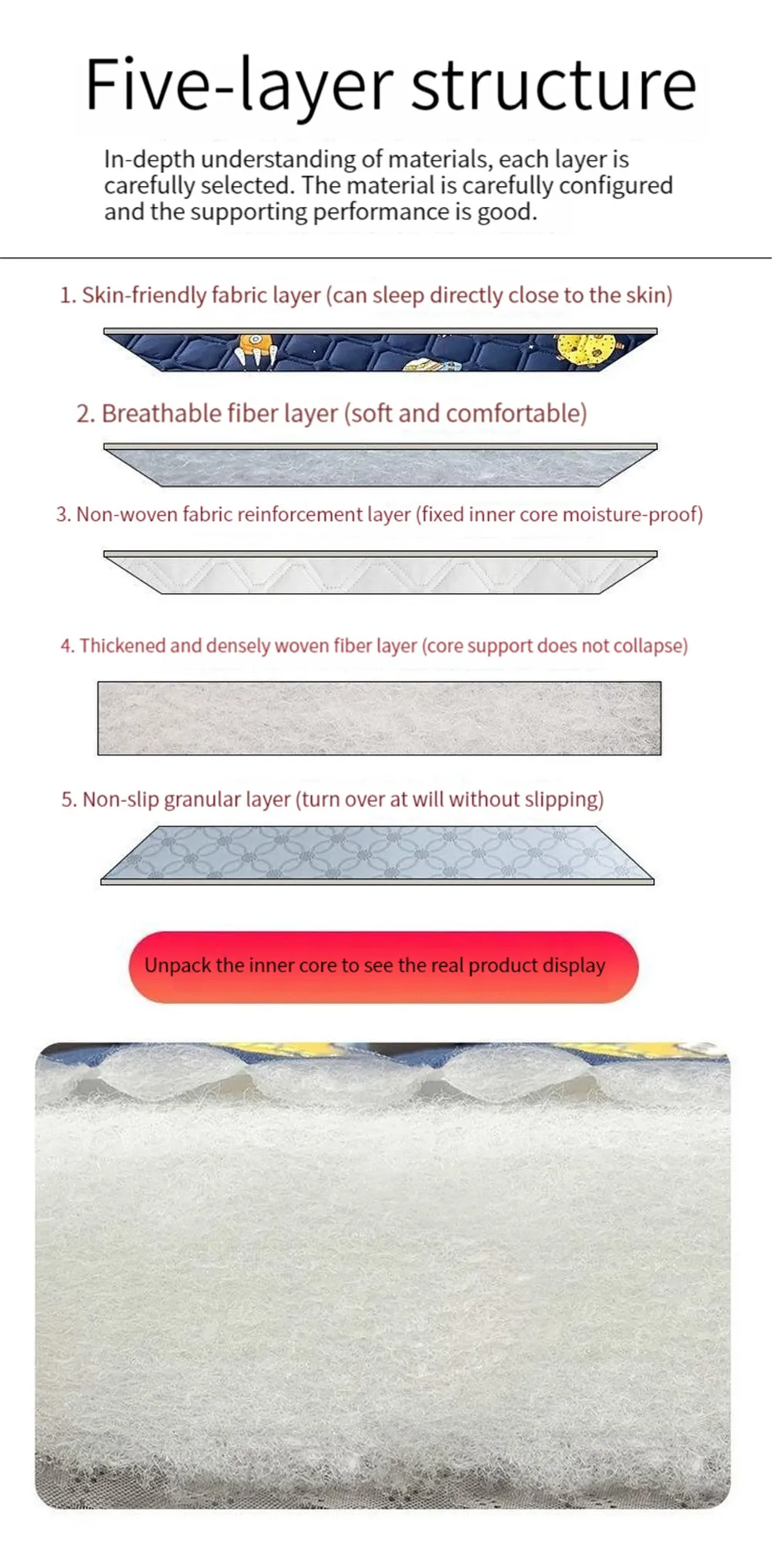 ★3: Experience comfort while lying flat, with no pressure on the body when sleeping on your side, and no pressure on the chest when lying face down. This mattress features a thick, skin-friendly fabric, a full layer of feather cotton, and a full layer of firm fixed cotton.