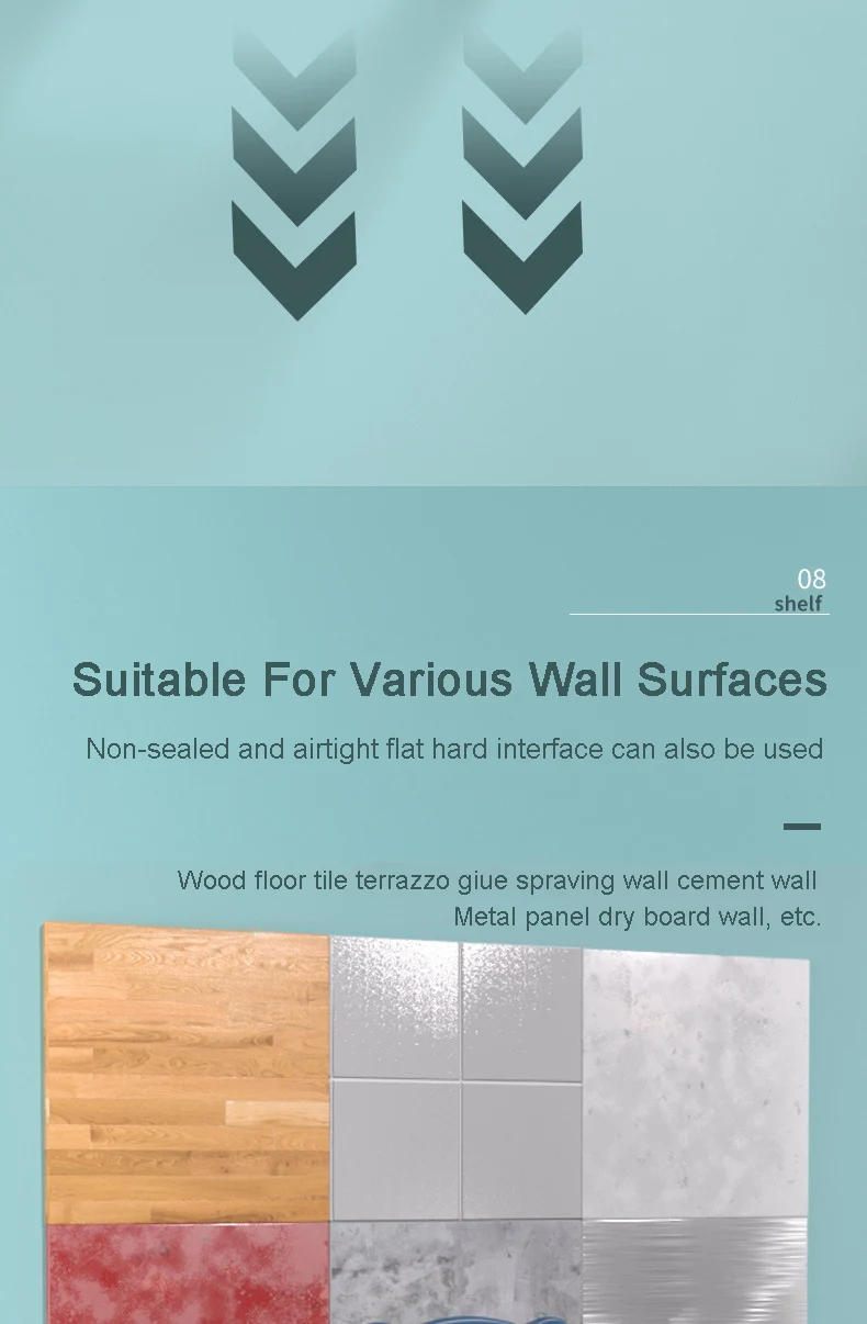 It is applicable to a variety of wall surfaces: non-sealed and airtight plane hard interface can also use wood floor tiles, terrazzo spray walls, cement walls, metal floors, dry-plate walls, etc.